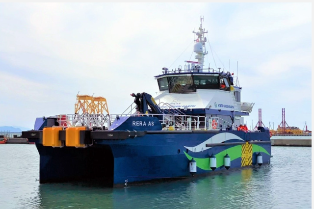 沖合に設置された洋上風力発電の風車へ定期点検・メンテナンスを行う作業員やメンテナンスパーツを運ぶために設計された専用船です。